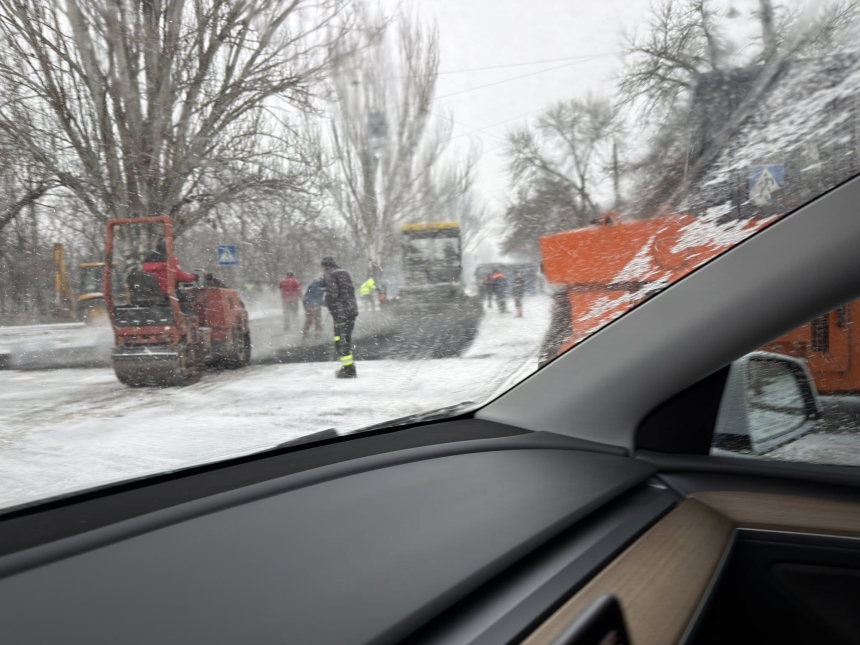 В Николаеве во время непогоды дорожники укладывали асфальт прямо на свежевыпавший снег.