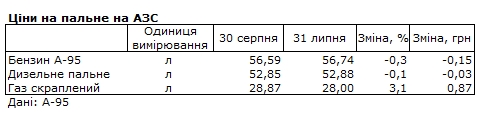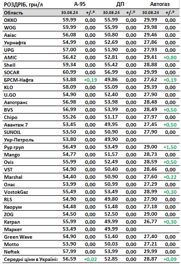 Розничные цены на бензин и дизель в Украине снизились в августе 2024 года. Автогаз подорожал на АЗС.