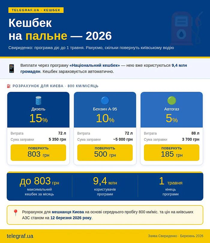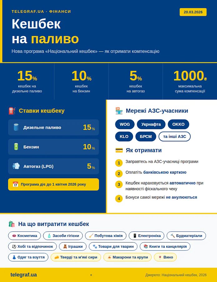 С 20 марта 2026 года в Украине начнет действовать новая программа поддержки граждан, предусматривающая частичную компенсацию расходов на топливо. Речь идет о кешбеке за заправку в рамках программы «Национальный кешбек».