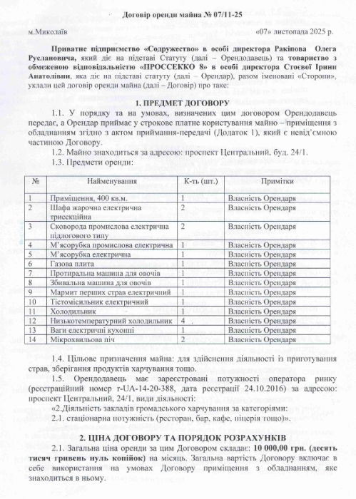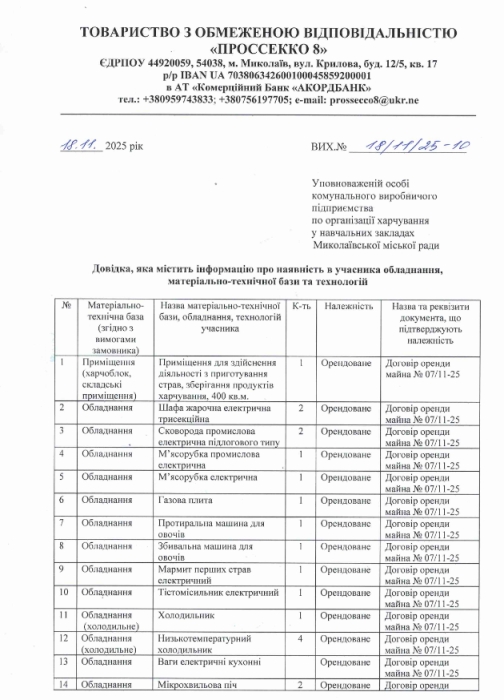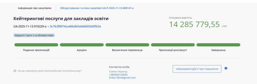Отметим, что изначально КП объявляло тендер на оказание кейтеринговых услуг для учебных заведений на сумму 14 285 779,55 гривен. При этом заявку подал всего один участник – ООО «ПРОССЕККО 8». Фирма выступила с предложением выполнить данную работу за 14 279 658,56 гривен. Отметим, что договор подписали 1 декабря на месяц – он действителен до 31 декабря 2025 года (включительно).