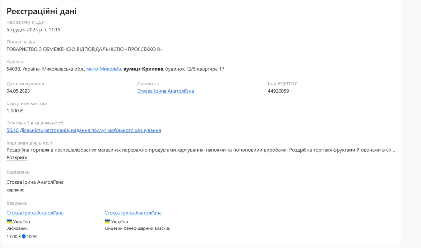 Согласно информации размещенной на платформе Opendatabot владелицей ООО «ПРОССЕККО 8» является Ирина Стоева, уставной капитал фирмы - 1000 гривен. Также согласно открытым данным, ООО «ПРОССЕККО 8» было основано еще в 2023 году, однако деятельность фирмы не была успешной (в 2024 году там был зарегистрирован всего один сотрудник, а чистая прибыль предприятия составила минус 28 100 гривен). До 2025 года фирма не принимала участие в тендерах, согласно с открытыми данными. Договор подписанный с Коммунальным производственным предприятием по организации питания в учебных заведениях оказался первым и сразу на 14 миллионов, вот это везение.