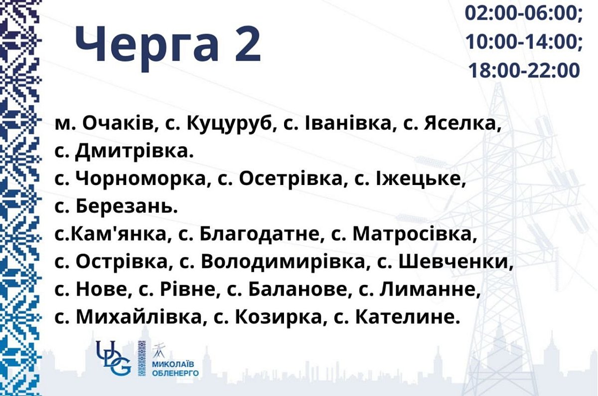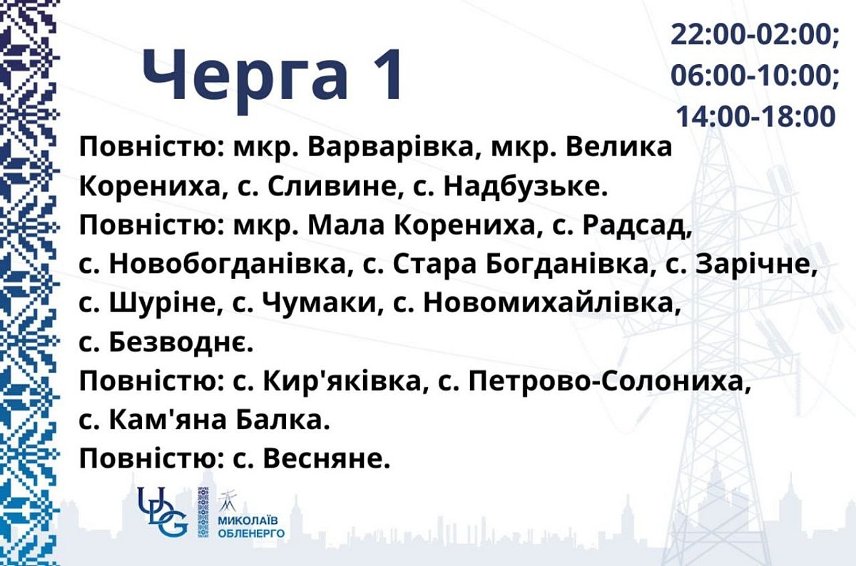В Николаевской области ввели локальные графики отключений также для потребителей Варваровского и Очаковского участков.