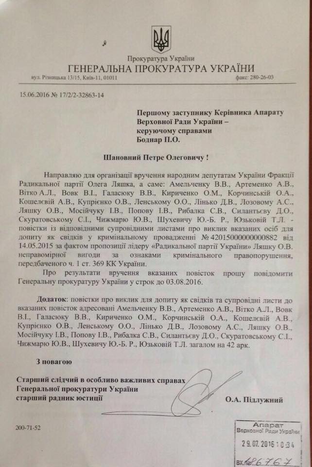 Председатель парламентской фракции Радикальная партия Олег Ляшко заявил, что его фракцию в полном составе вызвали на допрос в Генеральную прокуратуру Украины. Об этом он написал на своей странице в соцсети Facebook.
