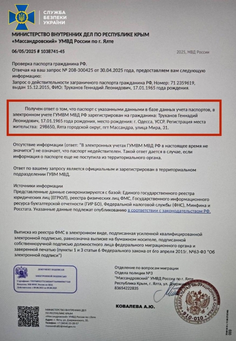 Служба безопасности установила, что Геннадий Труханов является гражданином Российской Федерации и имеет действующий заграничный паспорт страны-агрессора. Этот документ был выдан ему 15 декабря 2015 года, после начала российской агрессии против Украины, аннексии Крыма и оккупации части Донецкой и Луганской областей. Паспорт был выдан сроком на 10 лет и остаётся действительным.