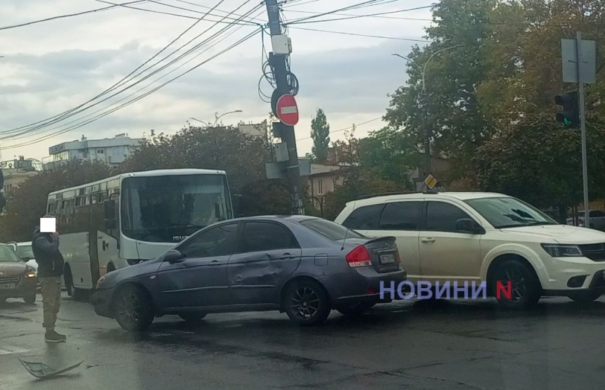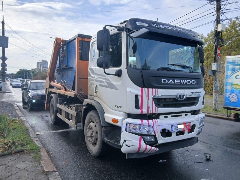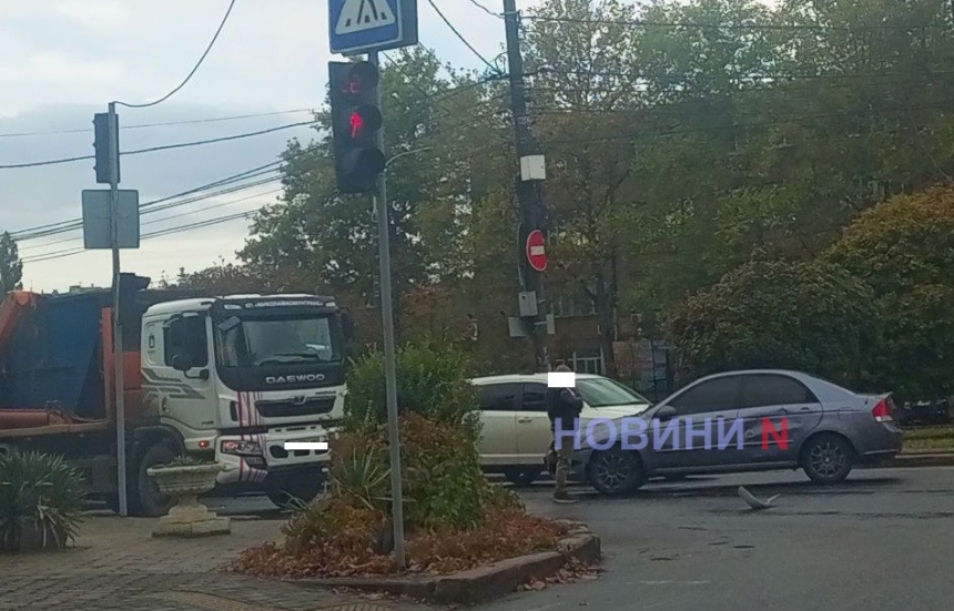 Утром в субботу, 18 октября, на перекрестке ул. Садовой и 68 Десантников столкнулся мусоровоз КП «Николаевкоммунтранса» Daewoo и легковой автомобиль «Киа».