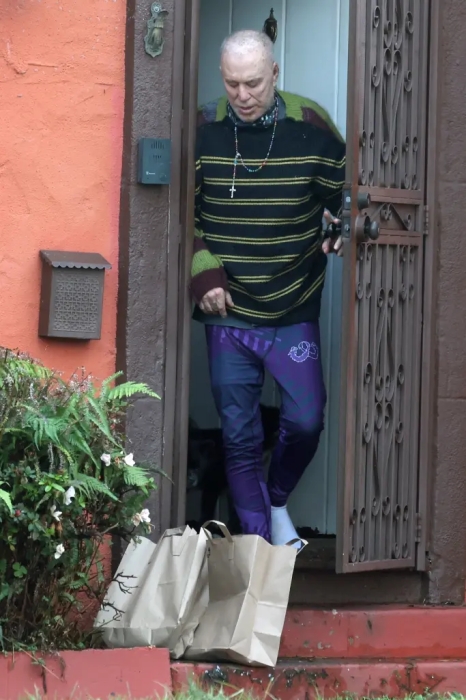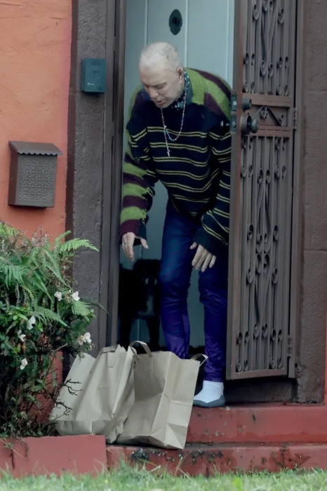 73-летний актер вышел из дома, чтобы забрать доставку еды: сначала пакеты с фастфудом, а затем продукты из супермаркета. Он был замечен с полностью выбритой головой, в ярком полосатом свитере, фиолетовых спортивных брюках и белых носках.