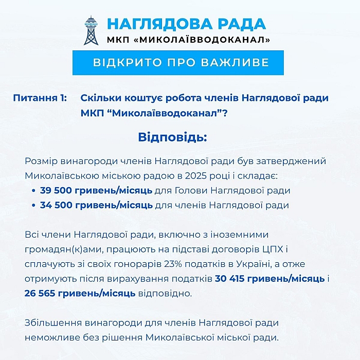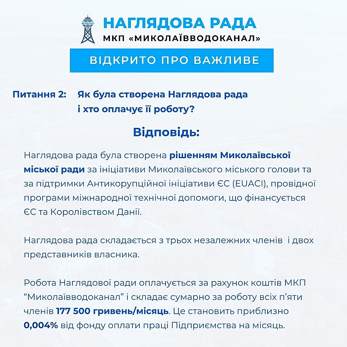 Работа наблюдательного совета оплачивается за счет средств МКП "Николаевводоканал" и составляет суммарно за работу всех пяти членов 177 500 гривен/месяц. Это составляет примерно 0,004% от фонда оплаты труда предприятия в месяц», - говорится далее.