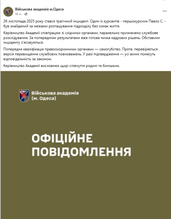 В среду, 26 ноября, в Одесской военной академии произошел трагический инцидент: найден мертвым курсант.