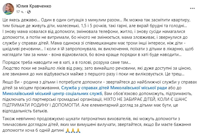 "Вам обязательно помогут, поддержат, подключат все партнерские общественные организации, никто не забирает детей, когда есть шанс поддержать семью и помочь. Но элементарный уход за детьми должен быть, это ответственность родителей", - резюмировала она.