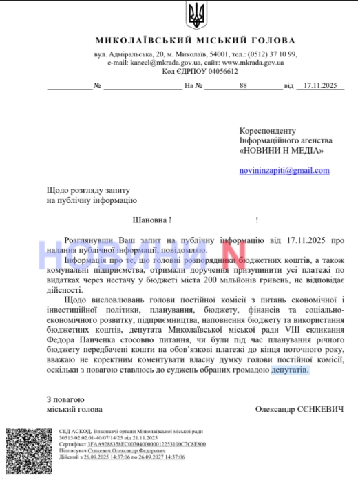 «Относительно высказываний председателя постоянной комиссии по экономической и инвестиционной политики, планирования, бюджета, финансов и социально-экономического развития, предпринимательства, наполнения бюджета и использования бюджетных средств, депутата Николаевского городского совета VIII созыва Федора Панченко по вопросу, были ли во время планирования годового бюджету предусмотрены средства на обязательные платежи до конца текущего года, считаю не корректным комментировать собственное мнение главы постоянной комиссии, поскольку с уважением отношусь к суждениям избранных общиной депутатов», - сказано в документе.