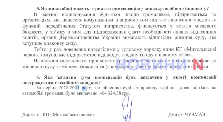 Согласно ответу на запрос «Новостей-N», КП «Николаевские парки» в период с 2022 по 2025 год выплатило компенсации горожанам на сумму 404 324,38 гривен за повреждения автомобилей, вызванные падением деревьев и веток. Однако для получения компенсации владельцам автомобилей необходимо обращаться в суд.