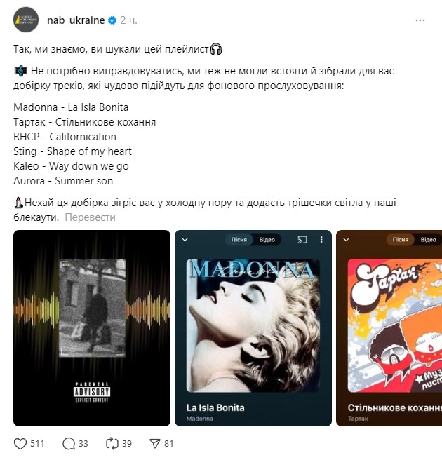 "Да, мы знаем, вы искали этот плейлист. Не нужно оправдываться, мы тоже не смогли устоять и собрали для вас подборку треков, которые прекрасно подойдут для фонового прослушивания... Пусть эта подборка согреет вас в холодное время и добавит немного света в наши блэкауты", — говорится в сообщении.