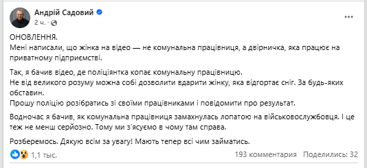 «Не от большого ума можно позволить себе ударить женщину, которая убирает снег. Прошу полицию разобраться со своими сотрудниками и сообщить о результатах», — заявил он.