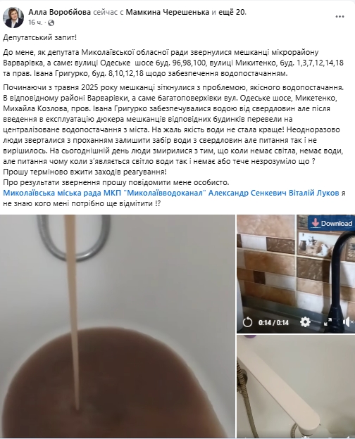 По словам депутата, к ней обратились жители домов по улицам Одесское шоссе (дома 96, 98, 100), Никитенко (дома 1, 3, 7, 12, 14, 18) и переулку Ивана Григурко (дома 8, 10, 12, 18) с жалобами на отсутствие стабильного и качественного водоснабжения.