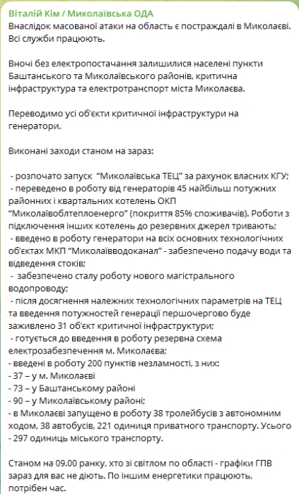Отмечается, что ночью без электроснабжения остались населённые пункты Баштанского и Николаевского районов, критическая инфраструктура и электротранспорт города Николаева.