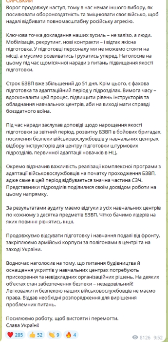 «Ключевая точка приложения наших усилий – не железо, а люди. Мобилизация, рекрутинг, новые контракты – и потому качественная подготовка. В подготовке персонала мы не можем стоять на месте, а должны развиваться и двигаться вперед. Отметив это во время ежемесячного совещания по вопросам повышения качества подготовки», — подчеркнул Сырский.