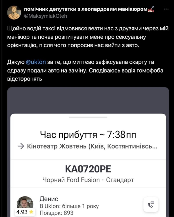 О случившемся помощник народной депутатки Марии Мезенцевой и проектный менеджер организации «Точка опоры» Олег Максимьяк сообщил на своей странице в соцсети. По его словам, после того как водитель обратил внимание на его маникюр, он начал расспрашивать его о сексуальной ориентации, а затем попросил покинуть авто. Скриншоты переписки, которыми поделился пассажир, показывают, что водитель, Денис, работает в Uklon более года, имеет высокий рейтинг и почти 900 поездок.
