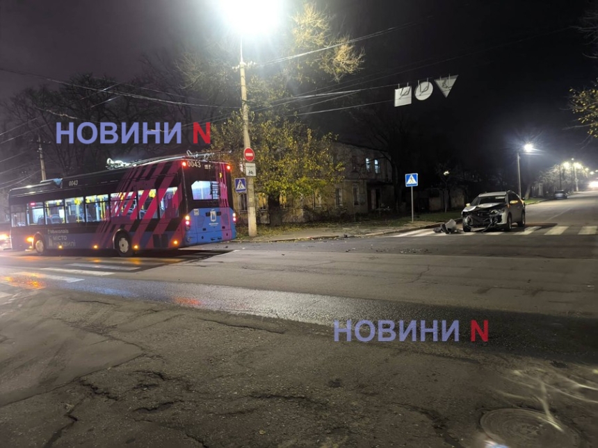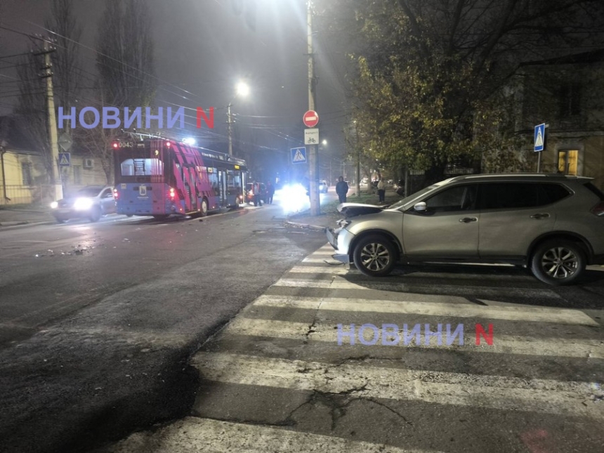 Вечером в среду, 3 декабря, на пересечении улиц Большой Морской и Гражданской в Николаеве столкнулись троллейбус 9-го маршрута и кроссовер Nissan Rogue.