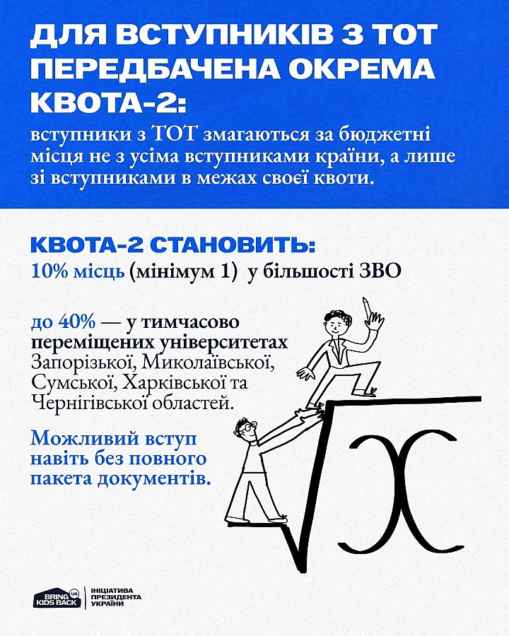 Квота-2 передбачає окремий конкурс на бюджетні місця: у ньому беруть участь вступники з ТОТ та територій активних бойових дій. У більшості університетів це 10% місць (але не менше одного), а в переміщених ЗВО – до 40%.