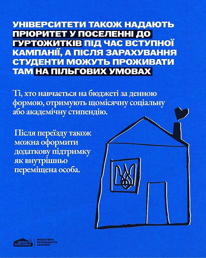 На час вступу надається безоплатне житло, а молодь до 23 років може отримати одноразову державну допомогу – 50 000 грн. Також передбачені стипендії, пільгове проживання в гуртожитках і додаткова підтримка після переїзду.