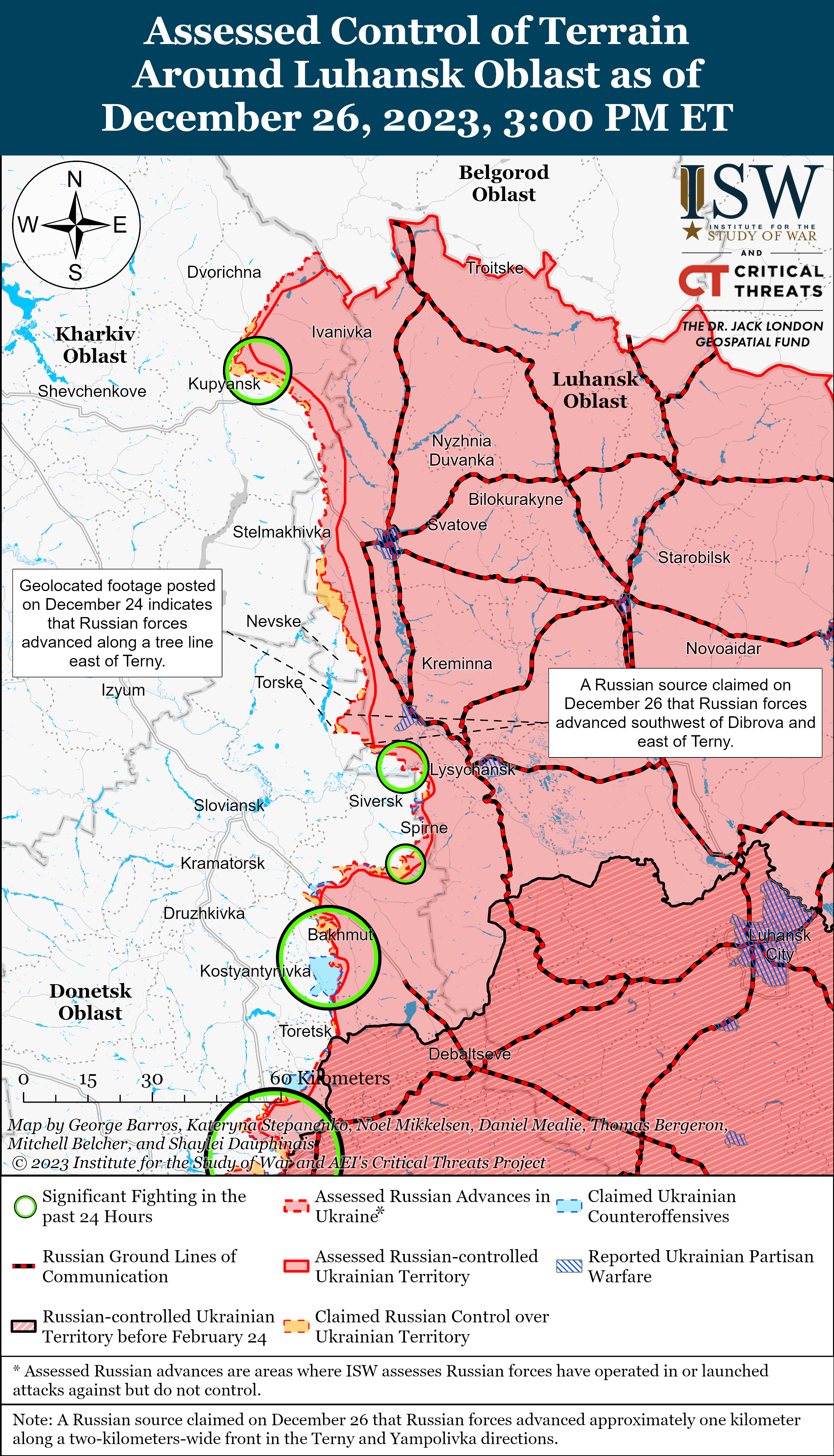 Сотрудники ISW выяснили, что недавно российские войска подтвердили наступление в районе Купянска. Видео с геолокацией, опубликованное 24 декабря, показало, что российские войска незначительно продвинулись к юго-западу от Первомайского (к северо-востоку от Купянска).