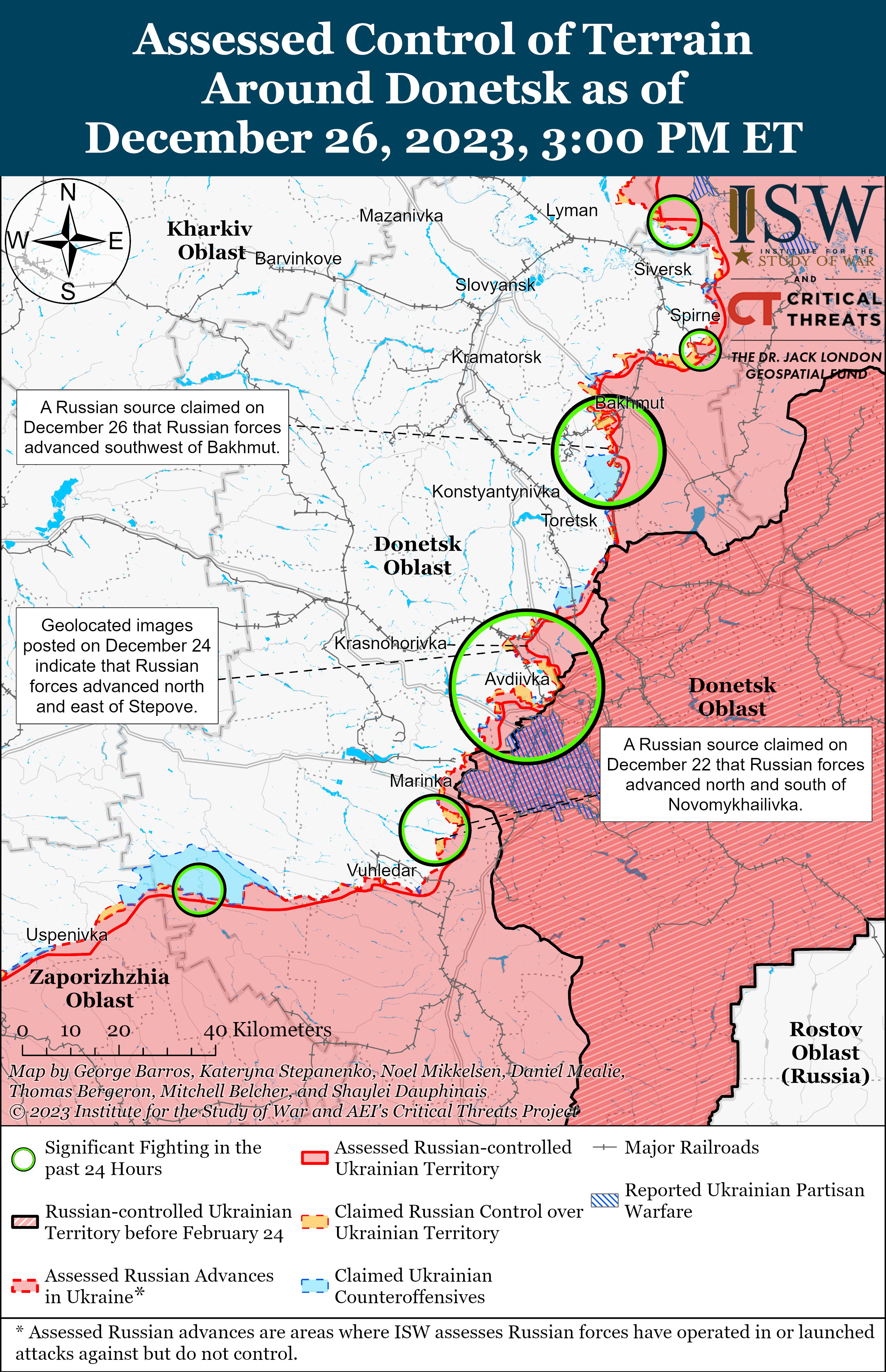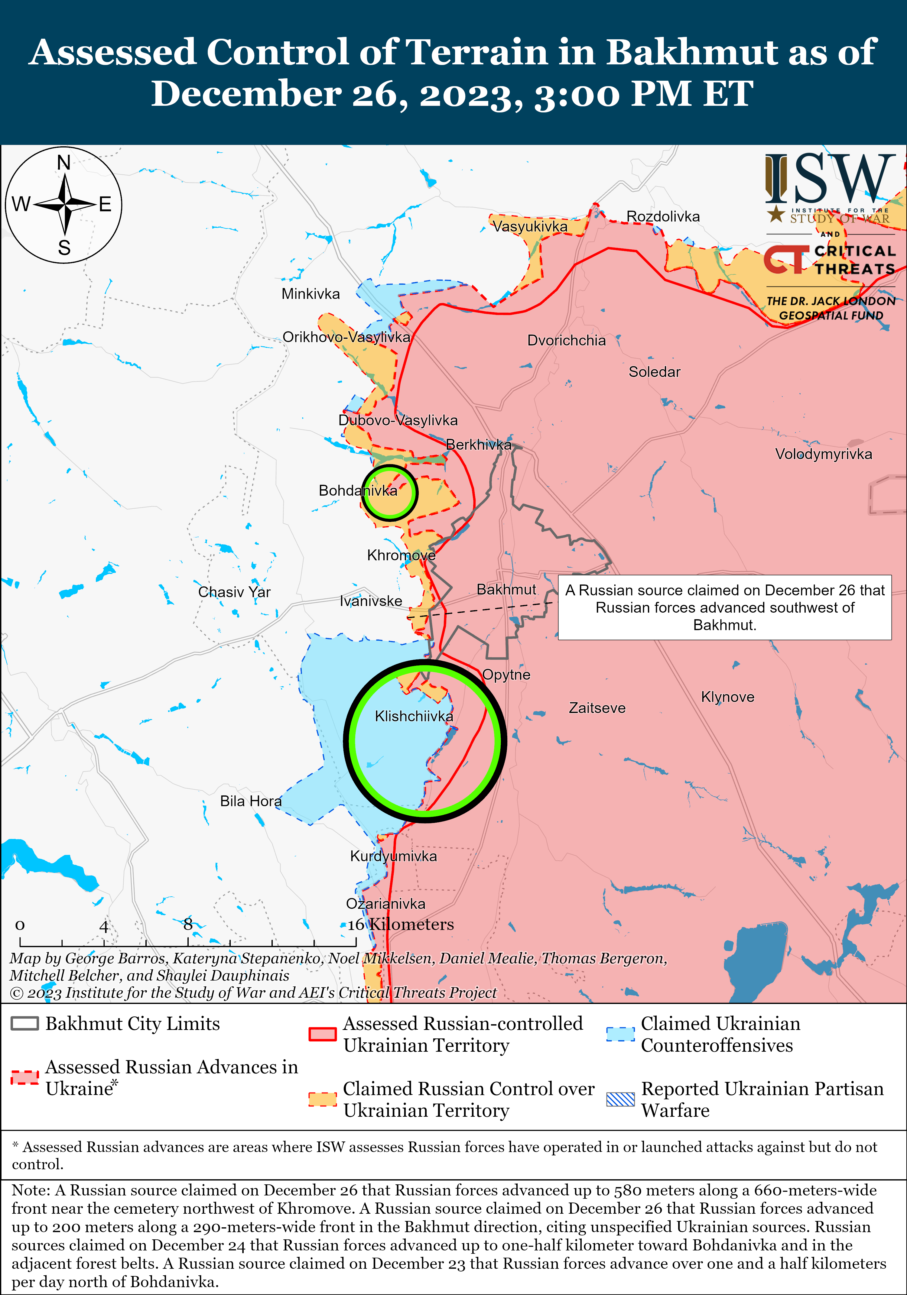 По словам ISW, российские войска атаковали близ Веселого (20 км к северо-востоку от Бахмута) 25 декабря, но не продвинулись вперед.