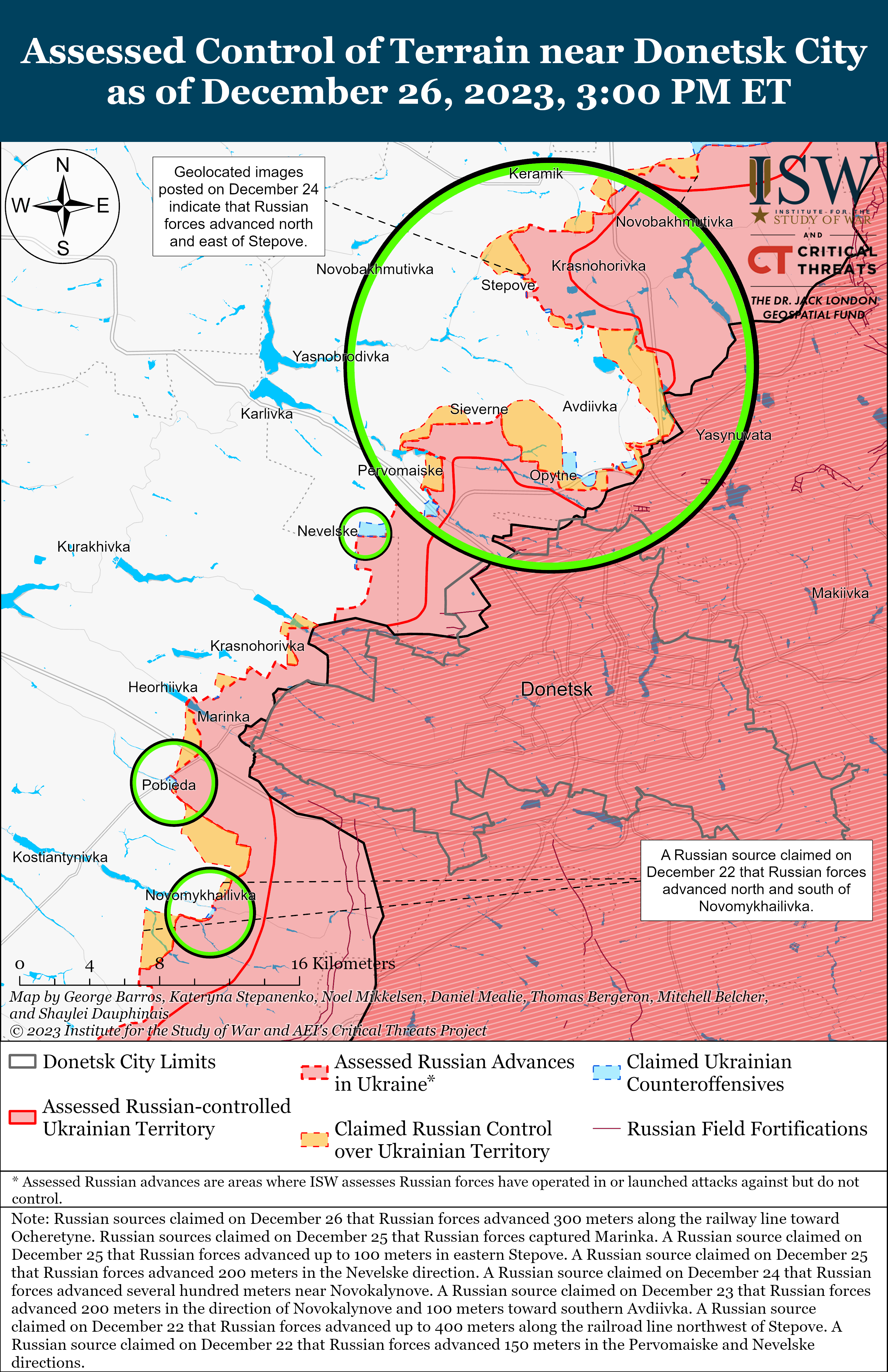 Видео с геолокацией, опубликованные 25 и 26 декабря, показывают, что российские войска продвинулись в северной части Степового (к северо-западу от Авдеевки), на северных окраинах Опытного (к юго-западу от Авдеевки) и в промышленной зоне к юго-востоку от Авдеевки.