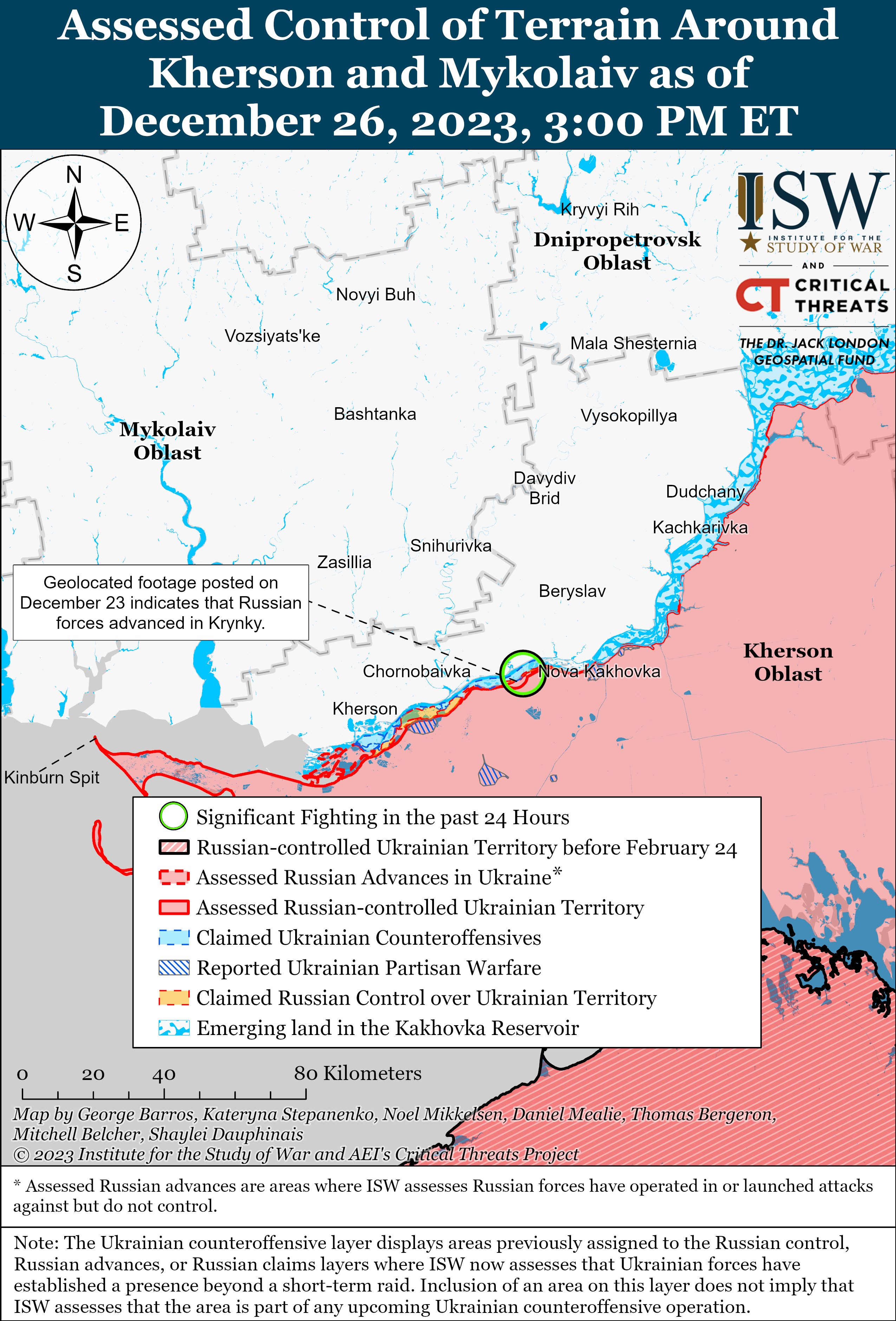 Украинские войска сохраняют позиции в левобережной Херсонской области по состоянию на 26 декабря, но ни российские, ни украинские силы не добились подтвержденных успехов в этом районе 25 или 26 декабря.
