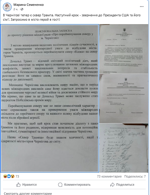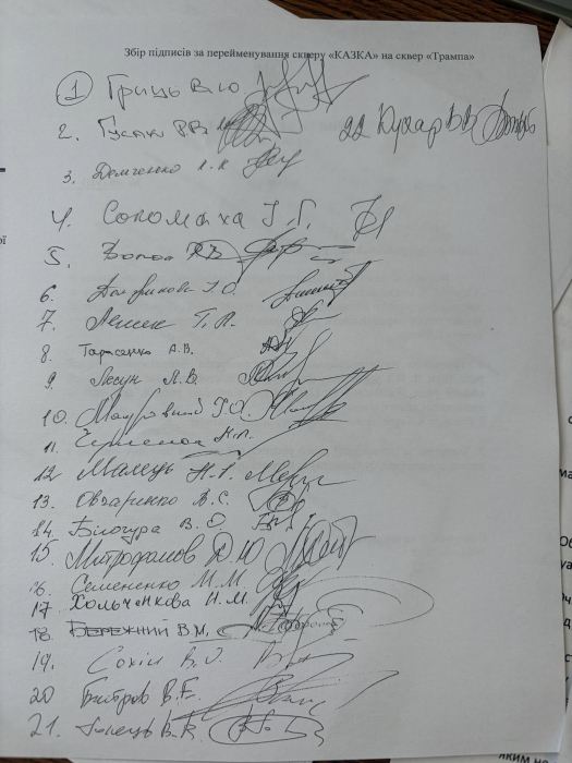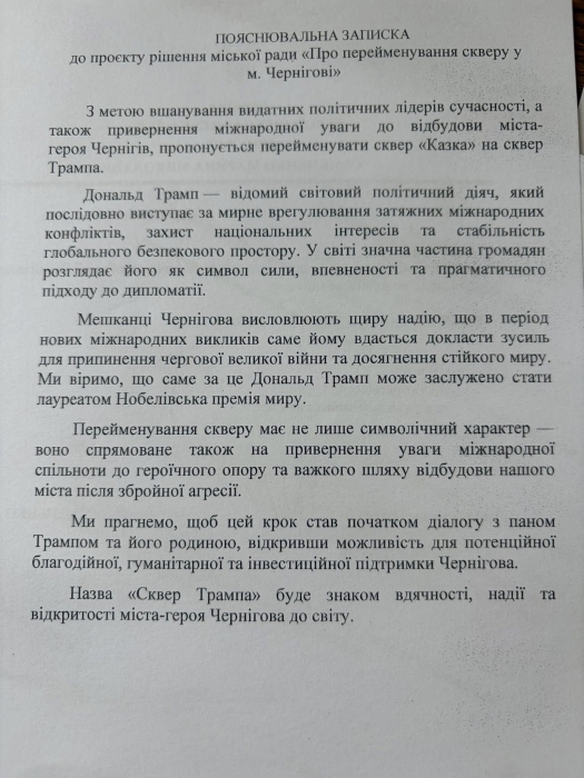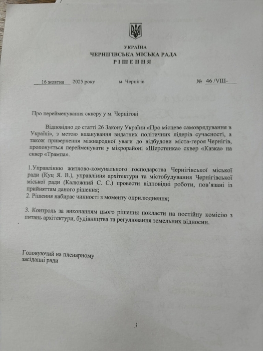 В четверг, 16 октября, на сессии Черниговского городского совета было принято решение о переименовании сквера «Сказка» в микрорайоне Шерстянка в сквер имени Дональда Трампа.