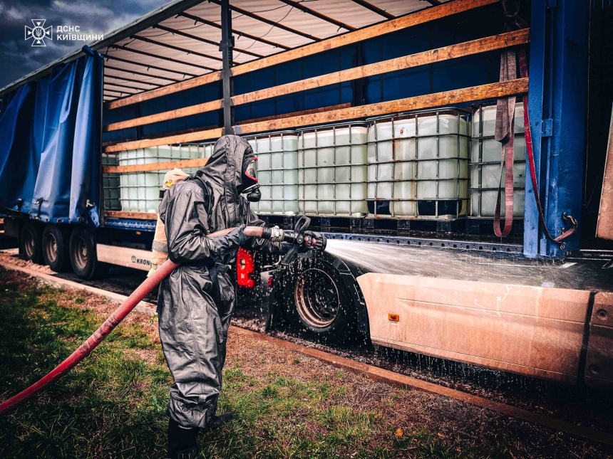 Как отмечается, на автодороге в селе Росава Обуховского района произошел разлив около 1 куб. м азотной кислоты из цистерны.