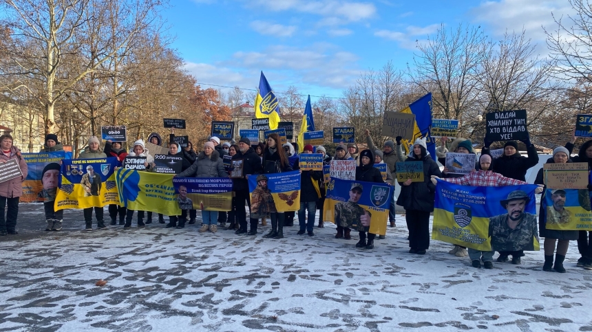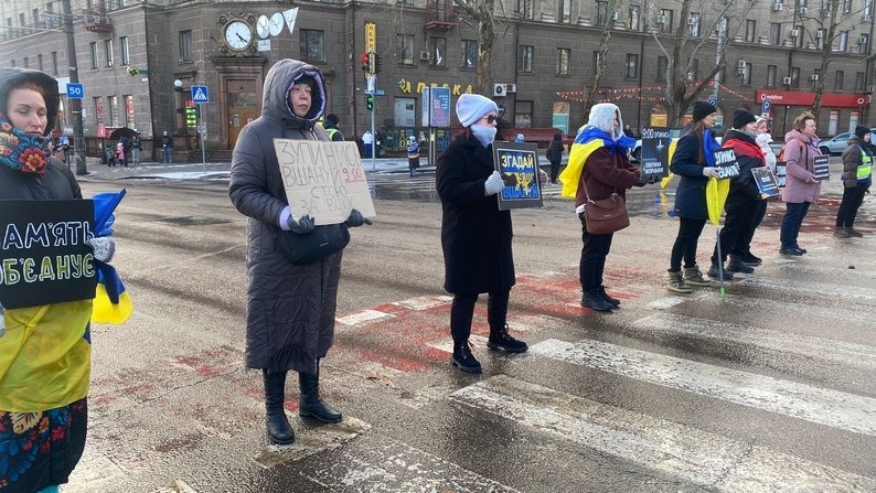 В воскресенье утром, 28 декабря, жители Николаева собрались в центре города с плакатами и украинскими флагами, чтобы почтить память погибших во время общенациональной минуты молчания.