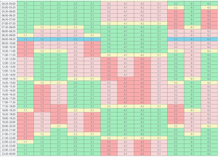 1.1 – 00:30 - 04:00; 08:30 - 14:30; 18:00 - 22:30;