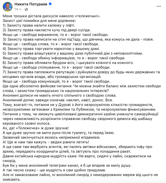В других пунктах своих аргументов в пользу защиты мессенджера народный депутат написал, что он против свободы обмена информацией, которая используется в Telegram, ведь там можно "поливать грязью всех", а также рушить доверие и репутацию любых государственных и местных органов власти или общественных организаций. В результате, как написал Никита Потураев дальше, анонимные публикации не имеют ничего общего со свободой слова, а являются лишь клеветой и доносом.