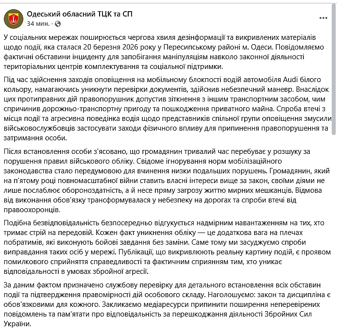 В Одесском областном ТЦК и СП прокомментировали инцидент, произошедший в пятницу, 20 марта, в Пересыпском районе Одессы, на фоне распространения видео инцидента в соцсетях.