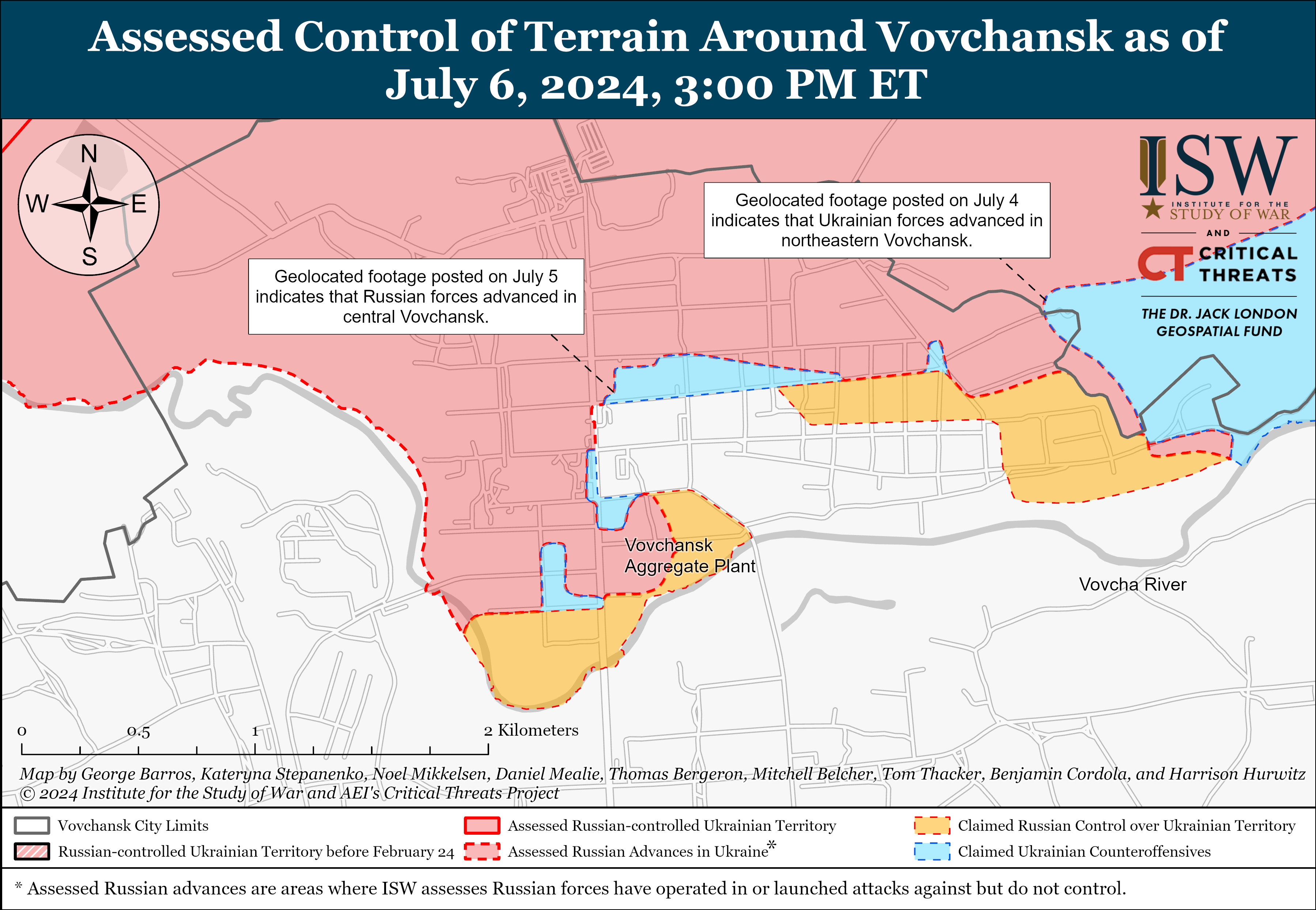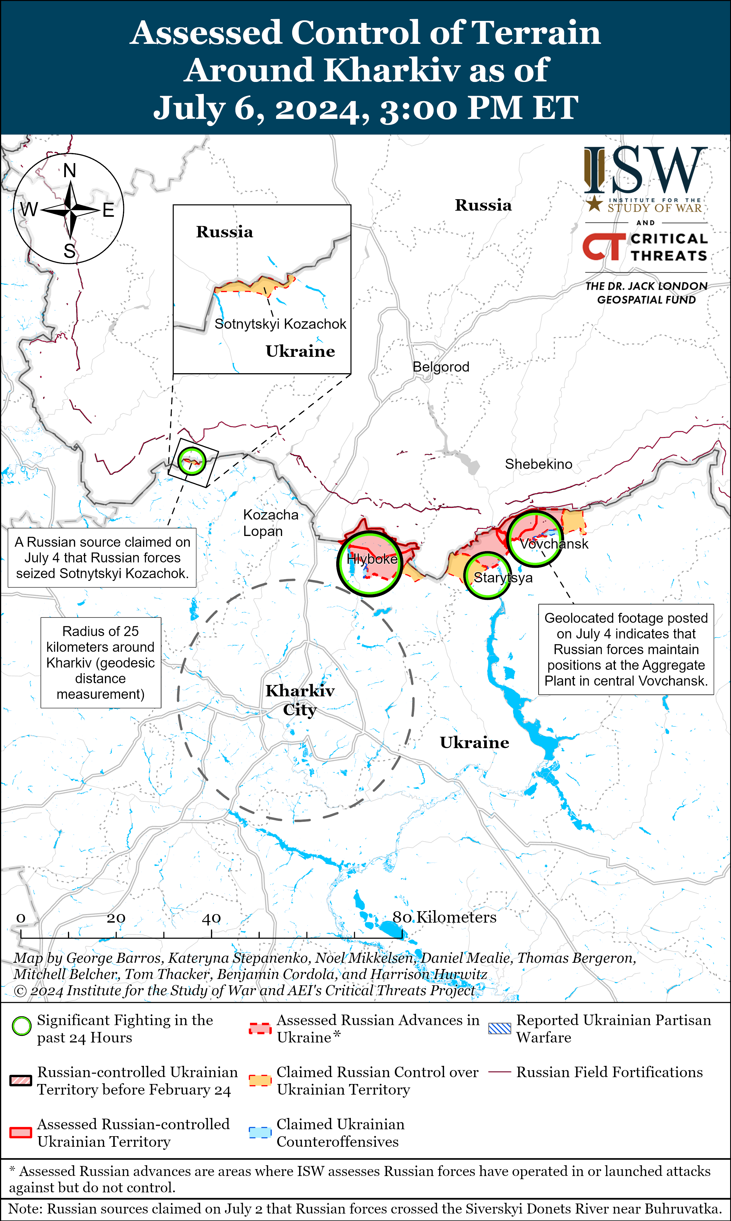 Как сообщили в ISW, 6 июля бои продолжались к северу и северо-востоку от Харькова, но подтвержденных изменений на линии фронта не было.