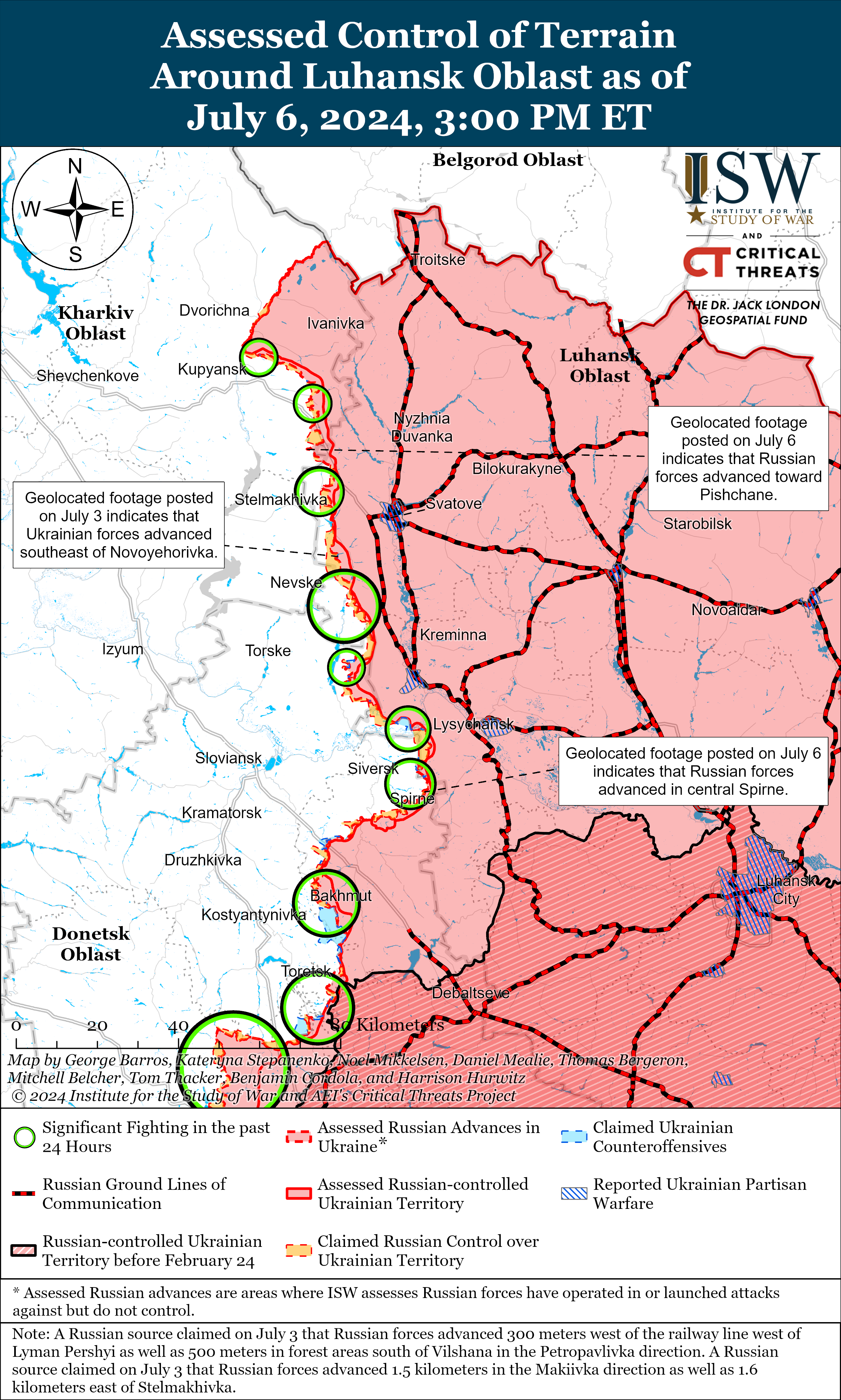 Кроме того, российские войска продолжили наступательные операции в районе Часового Яра 6 июля, но подтвержденных изменений на линии фронта не было.