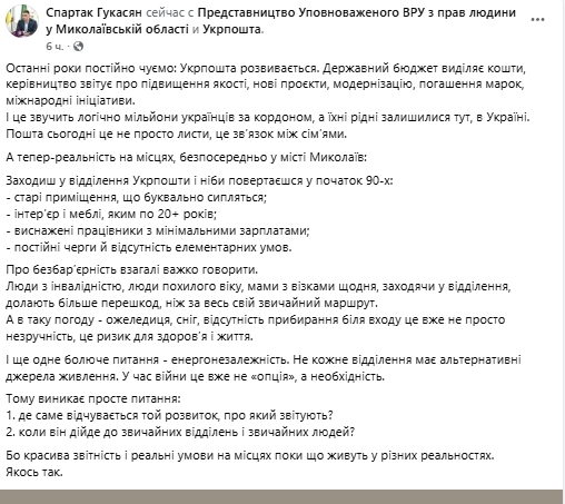 «Последние годы мы постоянно слышим: Укрпочта развивается. Государственный бюджет выделяет средства, руководство отчитывается о повышении качества, новых проектах, модернизации, погашении марок, международных инициативах. И это логично — миллионы украинцев за границей, а их родственники остались дома, в Украине. Почта сегодня — это не просто письма, это связь между семьями», — подчеркнул Гукасян.