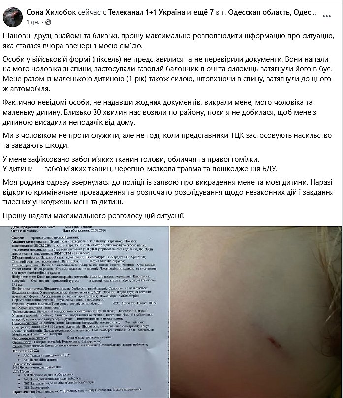 Жительница Одессы Сона Хилобок заявила, что военнослужащие Одесского областного территориального центра комплектования (ТЦК) якобы похитили её, её мужа и маленького ребёнка.