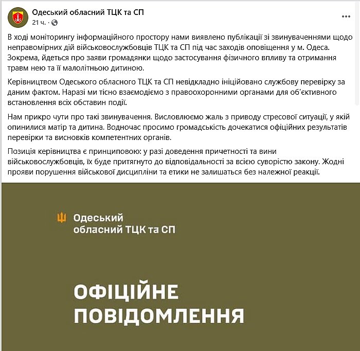 «Руководством Одесского областного ТЦК и СП безотлагательно инициирована служебная проверка по данному факту. Мы тесно взаимодействуем с правоохранительными органами для объективного установления всех обстоятельств происшествия.