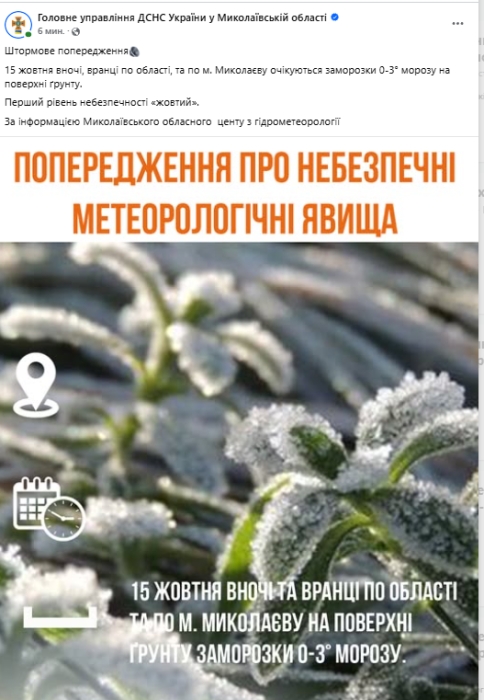 15 октября ночью, утром по области и по г. Николаеву ожидаются заморозки 0-3° мороза на поверхности почвы.