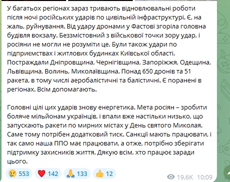 "Основные цели этих ударов — энергетика. Россияне хотят нанести удар по миллионам украинцев, пытаясь разрушить нашу энергетическую систему. Удары по мирным городам, включая обстрелы в День святого Николая, свидетельствуют о том, что россияне готовы идти на всё", — подчеркнул Зеленский.