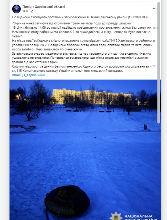 До поліції надійшло повідомлення про виявлення жінки без ознак життя. Тіло загиблої знаходилося на снігу, поряд був виявлений тюбінг. Постраждала померла на місці події від отриманих травм до приїзду бригади екстреної медичної допомоги.