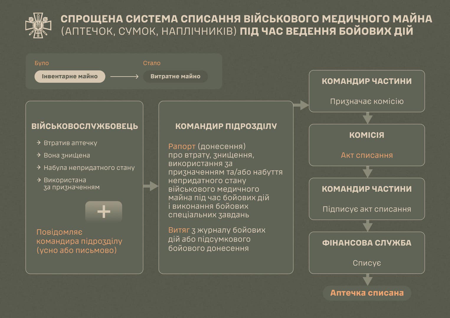 - Ці документи подаються командиру частини, який призначає комісію, формує акт списання (Додаток 4 до Порядку списання військового майна у Збройних Силах України та Державній спеціальній службі транспорту (пункт 5 розділу I), після чого командир частини підписує акт, а фінансова служба списує зазначене медичне майно.