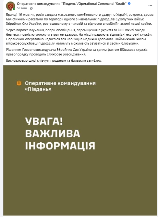 Вранці у четвер, 16 жовтня, Росія завдала масованого комбінованого удару по Україні, зокрема двома балістичними ракетами по території одного з навчальних підрозділів Сухопутних військ Збройних Сил України.