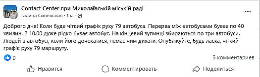 У коментарях одна місцева мешканка Олена Жук повідомила, що зверталася на підприємство «Миколаївпастранс» із цього приводу. За її словами, їй сказали, що затримки автобусів відбуваються через пробки на мосту.