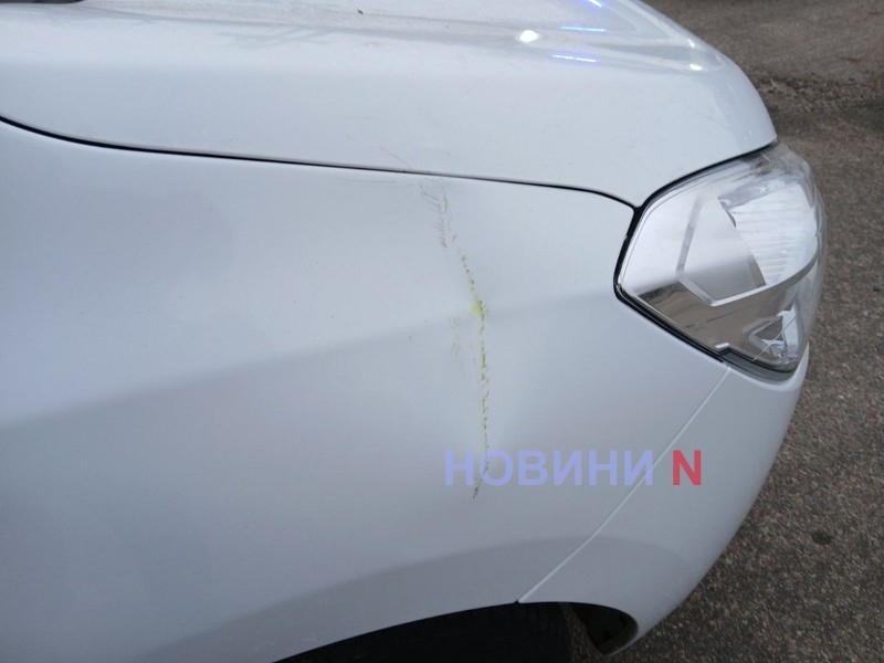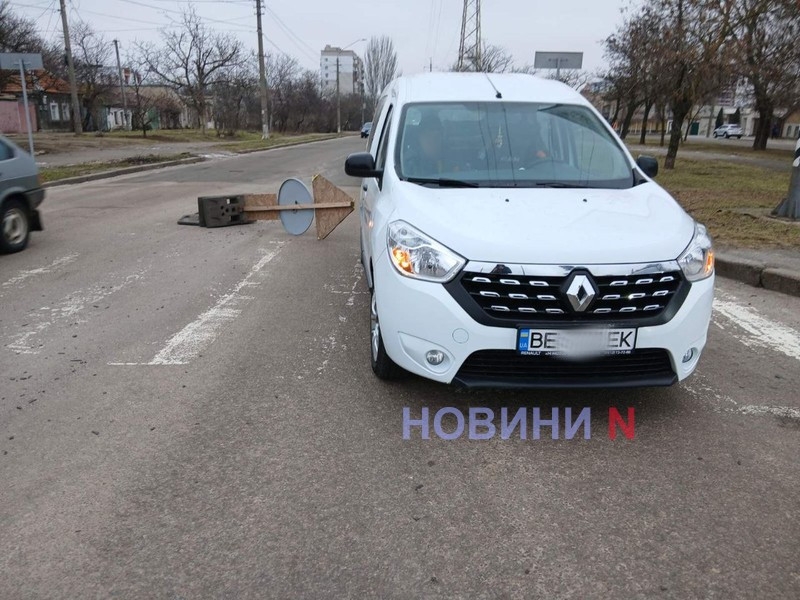 Дорожній знак упав на автомобіль, що стояв перед світлофором у Миколаєві (фото)