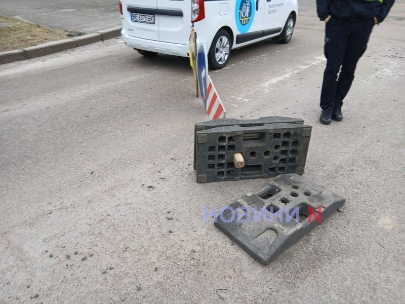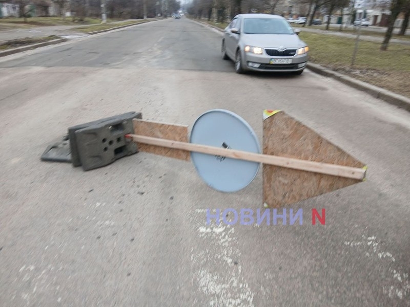 Вранці у середу, 18 лютого, у Миколаєві по вул. Ігоря Бедзая (колишня Чкалова), тимчасовий дорожній знак, що стояв посеред дороги, впав прямо на автомобіль.
