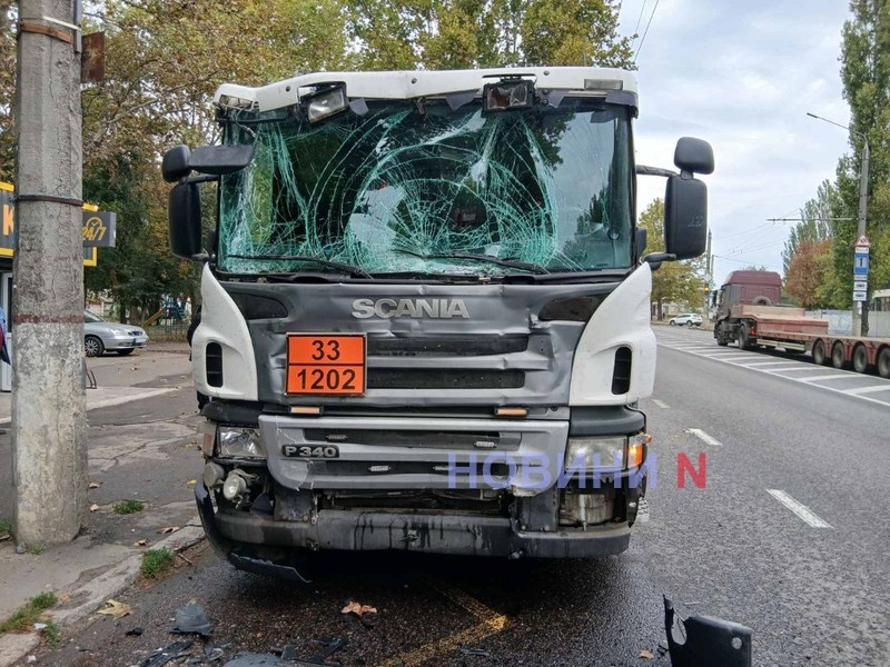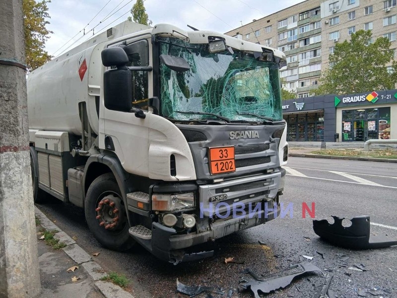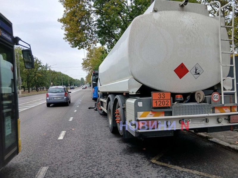 Вдень у вівторок, 7 жовтня, на проспекті Героїв України в Миколаєві тягач Scania з бочкою на напівпричепі врізався в міський тролейбус.