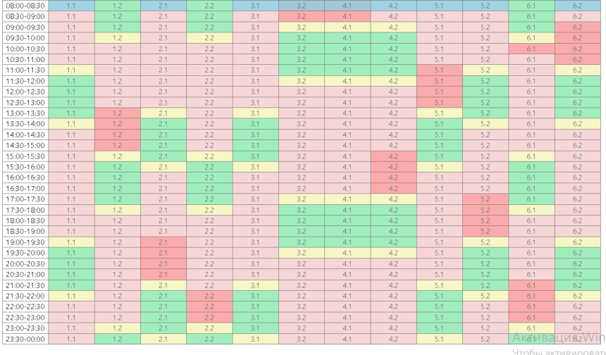 6.2 – 05:30 – 11:30; 13:30 – 19:30; 21:30 – 00:00.