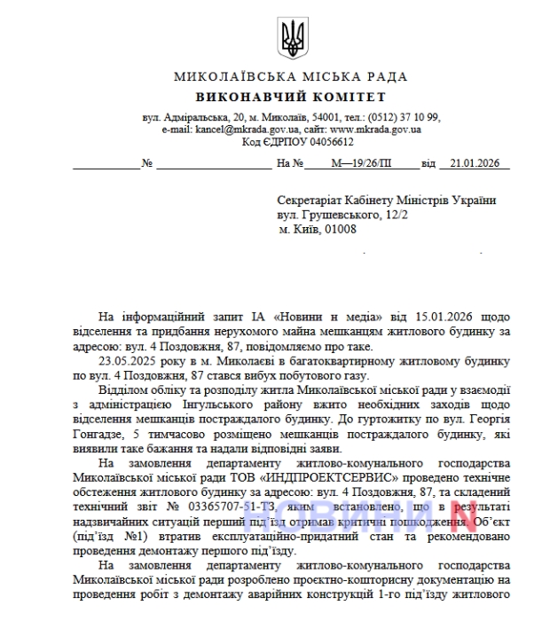 Нагадаємо, що 23 травня 2025 року у багатоповерховому житловому будинку за адресою: вул. 4-а Поздовжня, 87, у Миколаєві  стався вибух на першому поверсі першого під'їзду. Вибух призвів до серйозних руйнувань, необхідності відселення мешканців та повного демонтажу першого під'їзду. Частина мешканців погодилася тимчасово оселитися у гуртожитку за адресою: вул. Георгія Гонгадзе, 5, інші віддали перевагу тимчасовому розташуванню у родичів. Знаючи про важке становище постраждалих миколаївців, «Новини-N» направили запит до Кабінету Міністрів та Верховної Ради України, щоб дізнатися, чи можуть мешканці цього будинку розраховувати на якусь компенсацію чи держдопомогу.